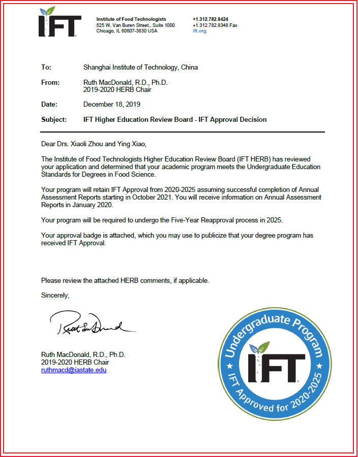12月18日, IFT(the Institute of Food Technologists,美国食品科学技术学会)总部致函我校,经IFT高等教育认证委员会(Higher Education Review Board, HERB)审议及决议,我校香料学院食品科学与工程专业正式通过IFT认证,获五年满额认证(2020年-2025年),成为2018新版IFT认证标准执行后首批通过IFT国际专业认证的高校。