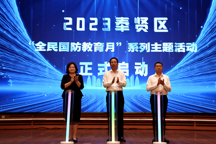 奉贤区委副书记唐晓腾、上海应用技术大学党委副书记陈海瑾、奉贤区副区长田哲共同启动2023年奉贤区“全民国防教育月”系列主题活动。