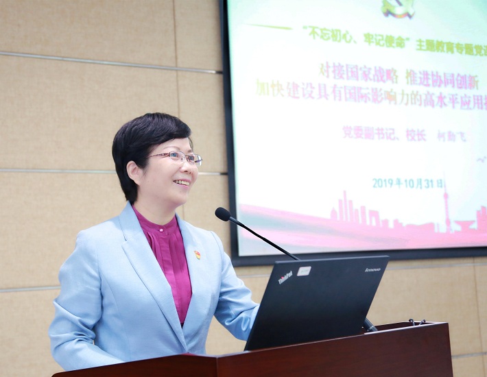 10月31日,按照学校“不忘初心、牢记使命”主题教育总体部署,校党委副书记、校长柯勤飞以“对接国家战略,推进协同创新,加快建设具有国际影响力的高水平应用技术大学”为题讲授主题教育专题党课。上海市委主题教育第十二巡回指导组副组长郑锦,组员郑虎、杨明磊,校领导宋敏娟、张锁怀,校党委常委、党委宣传部部长杨明,校党委常委、党委组织部统战部部长王占勇出席。全校中层干部、师生党员代表等共计200多人,齐聚奉贤校区图书馆B区101报告厅聆听党课。王占勇主持。