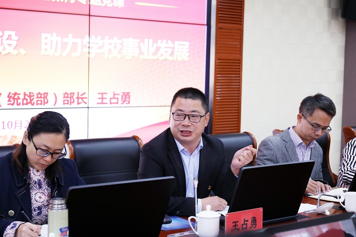 10月29日,王占勇以“强化干部队伍能力建设,助力学校事业发展”为题,为各学院专职组织员、后备干部、青年干部代表和机关第二党支部全体党员讲党课。他围绕干部队伍干事创业敢担当的力量源自于坚如磐石的初心使命,新时代新事业发展对干部队伍干事创业的能力提出了更高的需求,对标学校事业发展新需求选好用好培养好忠诚干净担当的干部队伍,守初心、担使命、促进事业发展等四个方面,阐述了锤炼党员干部忠诚干净担当政治品格的重要意义。他表示,要不断提高干部的战斗力,增强干事创业的凝聚力,不断学习,破解“本领恐慌”,以“功成不必在我,功成必定有我”的责任担当,不断锤炼干部干事创业的政治品格,不断将学校事业发展推向新的发展高度。