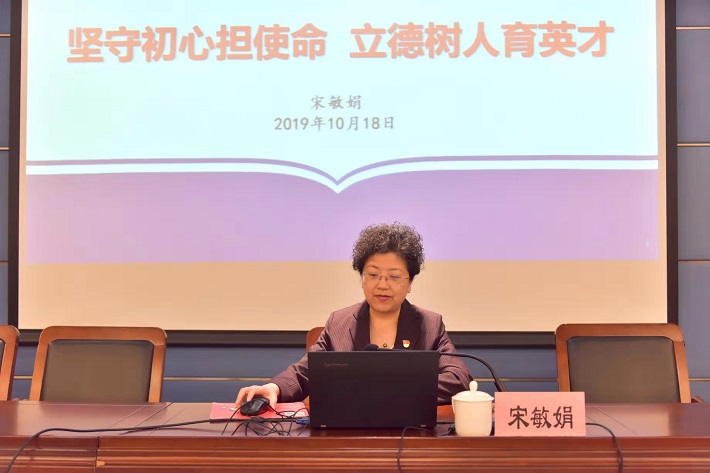 10月18日,宋敏娟以“坚守初心担使命、立德树人育英才”为题,为党委学工部及团委全体人员,各学院党总支副书记、副院长,专兼职辅导员讲党课。她从三方面深入浅出地讲解了“不忘初心、牢记使命”的历史逻辑、现实意义及实践路径,阐释了“不忘初心、牢记使命”的由来与立意,重点讲解了坚持“不忘初心、牢记使命”的必要性。她表示,要对标共产党人初心找差距,对照新时代中国特色社会主义思想和党中央决策部署、对照党章党规、对照人民群众新期待、对照先进典型和身边榜样,认真查找工作差距、有的放矢进行整改。她要求,要牢记守初心、担使命,全心全意为党育人、为国育才,为学生服务就是广大学生工作者的初心与使命、就是学生工作者为人民谋幸福的出发点与落脚点。