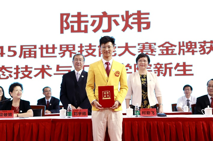 典礼上,刘宇陆为第45届世界技能大赛金牌获得者、2019级生态技术与工程学院陆亦炜同学颁发优秀新生校长特别奖。