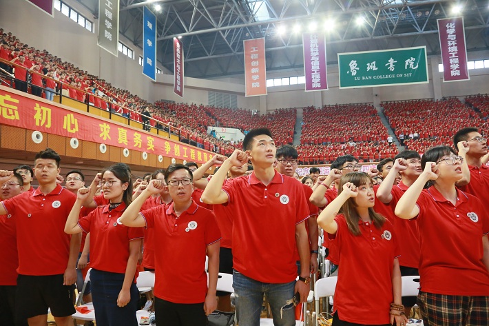 “我是上海应用技术大学学生,我愿以责任浇铸青春年华!厚德精技,砥砺知行。承工匠精神,养人文底蕴。求科学真理,担天下道义。明德明学明事,尽心尽力尽志,报效祖国,不辱使命,为实现中国梦而努力奋斗!”四千多名新生以“新上应大人”的身份庄严宣誓,从此在东海之滨的上海应用技术大学开启崭新的人生旅程。