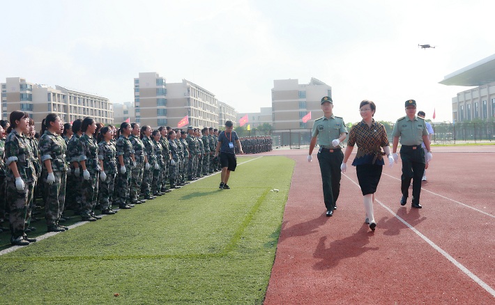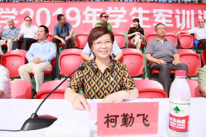 在庄严的升国旗仪式后,阅兵式正式开始。柯勤飞在军训团常务副团长、中国人民解放军73181部队李超林少校和杨军的陪同下检阅了学生方阵。全体2019级参训学生精神抖擞,意气风发。“同学们好!”“校长好!”“同学们辛苦了!”“为校争光!”的口号响彻校园。