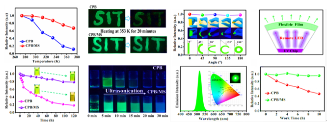 近期,我校材料学院房永征教授团队与中科院上海技术物理研究所、上海大学合作,在钙钛矿量子点自吸收效应及其柔性LED应用研究中取得新进展。通过原位生长方法,将钙钛矿量子点均匀生长于介孔氧化硅孔道内。由于氧化硅的高可见光透过率及其骨架的屏蔽作用,部分光子可以沿介孔m-SiO2通道传输,因此光子自吸收效应显著降低。实验结果表明,复合物CsPbBr3/m-SiO2粉末(68%)的光致发光量子产率明显高于CsPbBr3粉末(36%)。此外,由于介孔硅的保护作用,CsPbBr3量子点的化学稳定性、热稳定性和光稳定性明显提升,并最终制备了柔性发光二极管器件,实现了远程发光。该研究为钙钛矿量子点在柔性固态照明领域的应用提供了新思路。相关研究成果以“In situ growth of ultrasmall cesium lead bromine quantum dots in a mesoporous silica matrix and their application in flexible light-emitting diodes”为题发表于国际著名纳米类期刊Nanoscale,(2019,DOI: 10.1039/c9nr05731e), 上海应用技术大学研究生陈鹏为第一作者,房永征教授、刘玉峰副研究员及中科院上海技术物理研究所孙艳研究员为通讯作者。