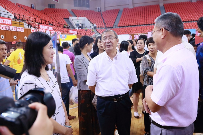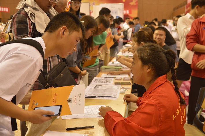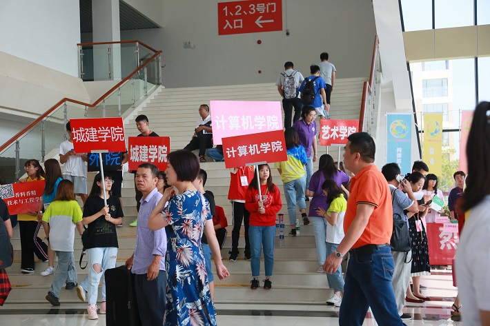 在体育馆新生报到大厅,到处洋溢着欢声笑语。每一位新生和家长走进大门,早已在那里等候多时的迎新志愿者高举指示牌,帮助和指引新生快速找到自己学院。各二级学院紧密结合学生实际和专业特色,精心筹划开展了各具特色的迎新服务。各学院接待点整齐排列,新生接待工作人员认真负责,一丝不苟,对家长、新生的各类问题进行耐心解答,将《新生报到流程图》、《学生服务手册》等发放到新生手中,不少学院通过微信群,QQ群和微信公众平台等新媒体,提前和新生建立联系,进行交流,及时向新生们推送有关报到、军训、入学教育、心理适应等内容,为新生提供从入学到大学生活所需要的指导信息。