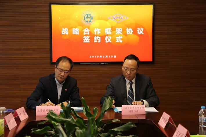 毛祥东、王宏祥分别代表双方签订了上海应用技术大学和上海市专利商标事务所有限公司战略合作协议。