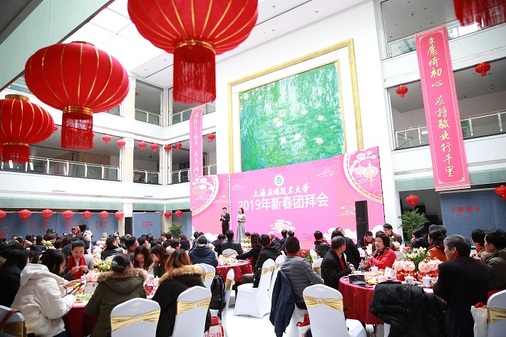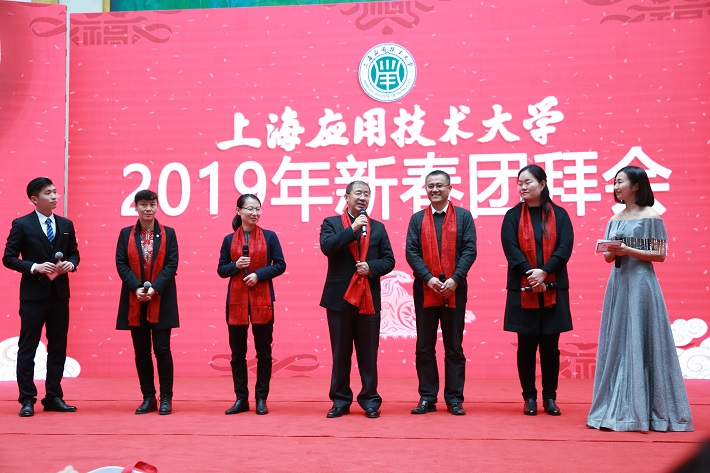 玉犬祥瑞欢辞旧岁、金猪如意恭迎新春。1月19日上午,徐汇校区图书馆内暖意融融,喜气洋洋,上海应用技术大学2019年新春团拜会在这里热烈举行。全国政协常委、上海市人大常委会原副主任、上海应用技术大学原副校长郑惠强出席。校党委书记刘宇陆致辞,校党委副书记、校长柯勤飞主持。校党委副书记宋敏娟,校党委副书记、纪委书记何星海,校党委副书记、副校长王瑛,副校长张锁怀,副校长毛祥东出席。学校原党委书记祁学银,原党委副书记、副校长朱国强,原副校长姜海山、任淑淳、瞿志豪、祝永康,原副校长、上海电机学院副院长陈东辉出席。奉贤区副区长袁园、上海铁路局原党委书记刘涟清、上海化工研究院原院长徐大刚等学校理事会理事、基金会理事和校友会理事出席。