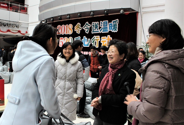 近日,学校开展2018年冬令送温暖520爱心行动。校党委副书记宋敏娟率队深入宿舍,逐一慰问了新生孤儿,亲手为他们传递学校的关怀和温暖,给他们送上温暖物资、爱心券、暖心礼包等,鼓励他们树立自信、积极规划大学生活,奋发成才。在全校冬令送温暖活动现场,宋敏娟对困难新生们给以关怀与鼓励,对活动现场发放物资的工作人员表示慰问,对本次行动的组织和开展予以充分肯定。