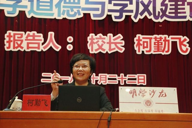 10月22日,校党委副书记、校长柯勤飞主讲明学沙龙(第二期)之研究生科学道德与学风建设报告会。她指出,研究生培养的定位是传播知识、传播思想、传播真理,塑造灵魂、塑造生命、塑造新人。高校应发展卓越而有灵魂的研究生教育,培养具有理想信念、家国情怀、社会责任的高水平应用型创新人才。随后,柯勤飞从着力科学研究、弘扬科学精神、坚守学术道德三个层面进行阐述。