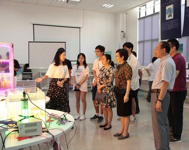 参观中,刘宇陆指出,要重视大学生科技社团在发展过程的传承与创新。柯勤飞勉励同学们要把中华文化融入到技术创新当中。张锁怀对参展作品提出了优化建议。