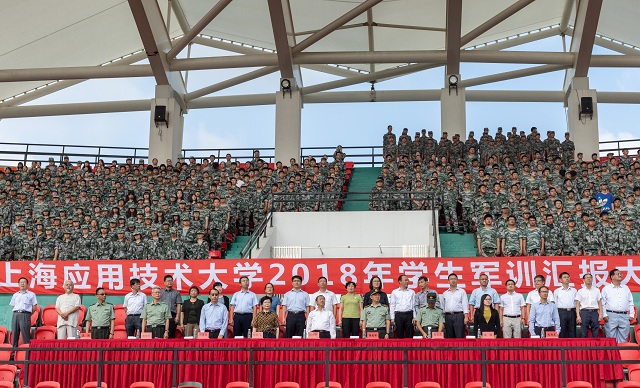 9月14日,我校2018年学生军训汇报大会在奉贤校区举行。校党委书记刘宇陆,校党委副书记、校长柯勤飞,校党委副书记、纪委书记何星海,校党委副书记、副校长王瑛,副校长张锁怀,副校长毛祥东,中国人民解放军73181部队大校储爱军,中国人民解放军73181部队上校、校军训团团长鲍俊成,校党委学工部部长、军训团副团长袁翔,校武装部部长、军训团副团长杨军出席大会。大会由张锁怀主持。