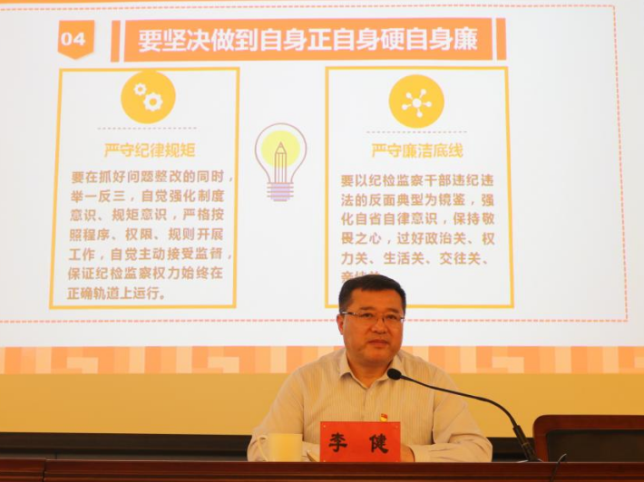 为深入学习贯彻习近平新时代中国特色社会主义思想主题教育、扎实推进纪检监察干部队伍教育整顿走深走实,6月8日,校党委副书记、纪委书记、监察专员李健为学校专兼职纪检监察干部、巡察干部和重点领域、关键岗位的党员干部讲授“廉政教育”专题党课。