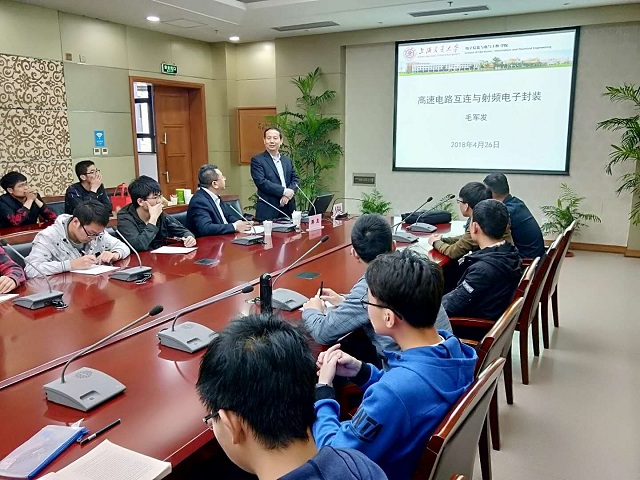 校庆月期间,4月26日,中国科学院院士、上海交通大学电子信息与电气工程学院院长、电磁场与微波技术专家毛军发教授应邀来校,主讲“高速电路互连与射频电子封装”学术讲座。该讲座为学术校庆之“大师风云”系列讲座之一。校科技处处长韩生主持讲座。