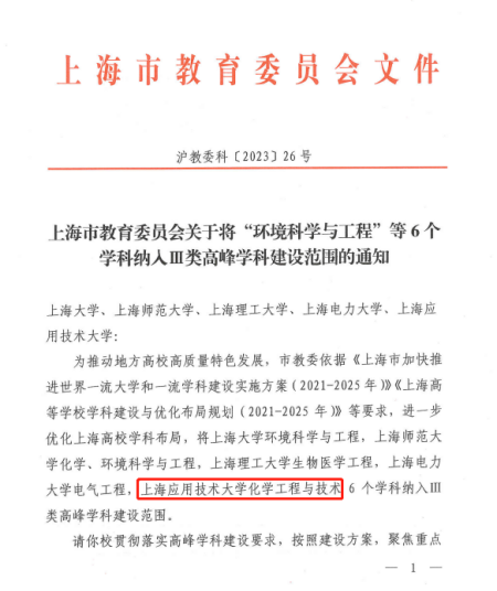 根据《上海市教育委员会关于将“环境科学与工程”等6个学科纳入Ⅲ类高峰学科建设范围的通知》,上海应用技术大学化学工程与技术学科成功获批为上海市Ⅲ类高峰学科,这是继学校获批博士学位授予单位和化学工程与技术一级学科博士学位授权点以及上海市高水平地方大学重点建设单位之后的又一新突破,标志着学校高水平学科建设再上新台阶。