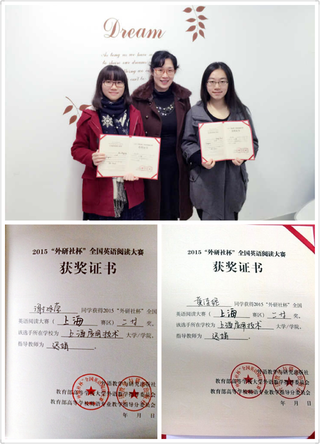近日,2015“外研社杯”全国英语阅读大赛上海赛区复赛在上海商学院举行,共吸引了来自复旦大学、上海交通大学、华东师范大学、同济大学、上海大学等十七所高校的34名精英选手参赛。经过激烈角逐,我校经管学院谢冰莹同学和黄佳妮同学在外国语学院迟娟老师的指导下,因丰富的词汇量,扎实的语言基本功,突出的思辨能力和人文修养,得到评审团的认可,双双荣获2015“外研社杯”全国英语阅读大赛(上海赛区)二等奖。