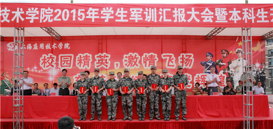 副校长叶银忠在典礼上宣读2015级新生入学奖获奖名单。校武装部长、军训团副团长刘广龙宣读了优秀学员、优秀教官和优秀指导员名单。随后校领导与承训部队领导为优秀教官、优秀指导员、优秀学员颁发了获奖证书。