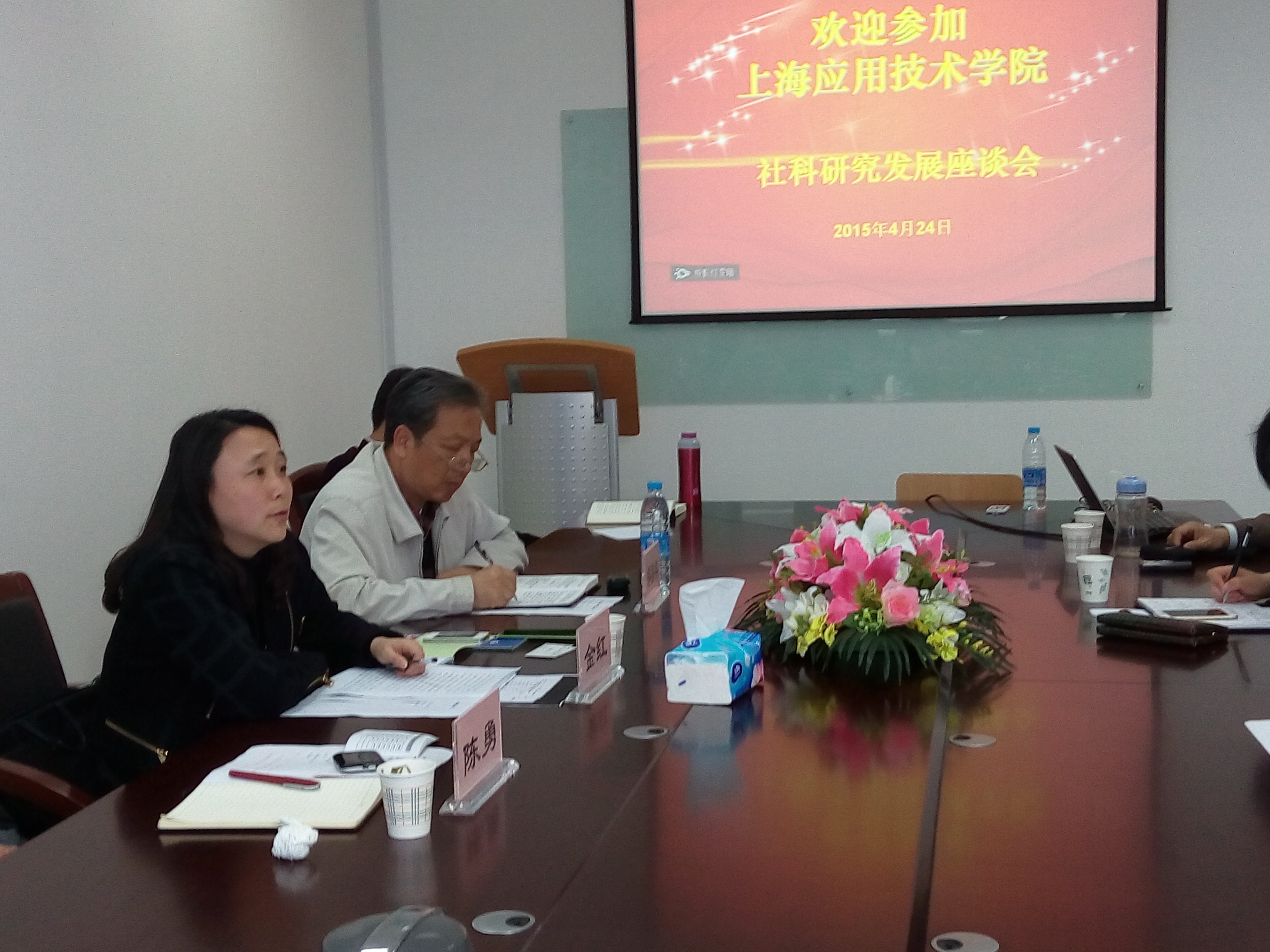 我校参会的四个主要开展社科研究的学院分别介绍了各自学院的师资队伍、学科研究方向、专业组成、科研成果等情况。金红讲话,她对我校取得的社科研究的成绩表示祝贺,并着重介绍了市社联的情况。市社联是全市社科研究管理的社团组织,负责组织和统筹上海市重大的社科活动,如:每年一度的“上海市社科研究学术年会”、“东方讲坛”等,是一个高层次、高水平、高凝聚力的组织和交流平台。金红向与会老师特别推荐了市社联科研处主管的“学术茶座”活动,该学术活动气氛活跃,形式多样,服务优良,每周五一次,她希望我校教师积极参加其中,多与大师对话和交流,进一步提升参与高水平社科研究的能力。