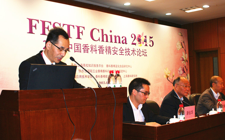 4月17日,由上海高校知识服务平台——香料香精及化妆品研究中心主办的“2015中国香料香精安全技术论坛”在我校徐汇校区隆重举行。研究中心管委会主任、副校长陈东辉,研究中心专家委员会主任、原校长卢冠忠,研究中心常务副理事长、香料学院院长、香料所所长肖作兵,上海食品添加剂行业协会秘书长吉鹤立以及美国化学协会农食分会主席Michael Qian等出席论坛。百余名来自企业、高校、科研院所的专家、教授以及香料学院的研究生参加论坛。