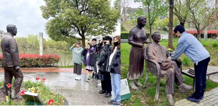 在詹守成、眭忠诠雕像前,电气学院、理学院和生态学院师生对铜像进行擦拭,并致献鲜花。同学们深切感悟詹沛霖家族家国情怀和大爱精神,参与过大师剧《祝尔纯》排演的学生向大家讲述着眭忠诠、祝尔纯两位老人的事迹。