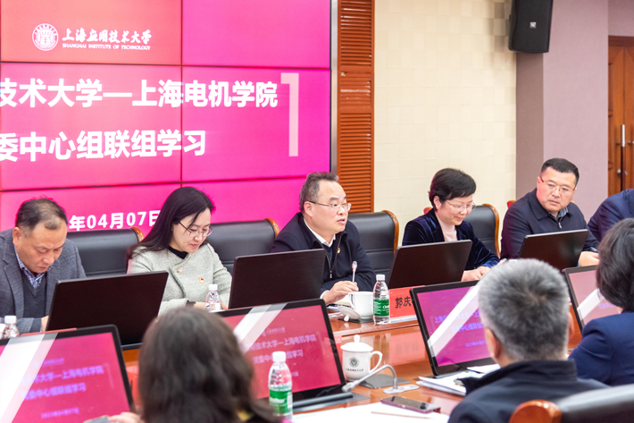 春日的上海应用技术大学校园,海风拂面,鲜花绽放。上海应用技术大学党委书记郭庆松,党委副书记、校长柯勤飞出席联组学习会。上海电机学院党委书记鲁雄刚,院党委副书记、院长龚思怡率校党委中心组成员出席联组学习会。郭庆松主持会议,鲁雄刚在会上讲话。