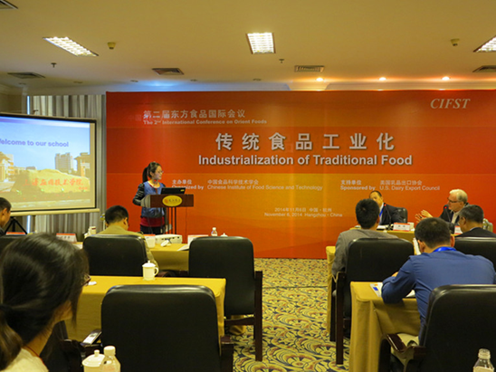 11月4日至6日,中国食品科学技术学会第十一届年会在杭州召开,我校香料学院生物化工专业硕士研究生刘芳芳应邀在此次年会的东方食品论坛分会场上用做题为《Evaluation of different analytical methods for the encapsulation efficiency of amylose-flavor complexes》的全英语学术报告,我校研究生已连续两年在该会议上作专题报告。