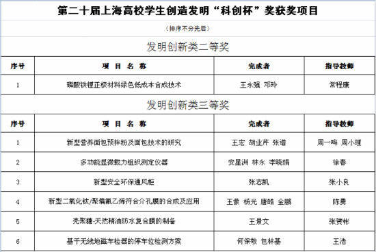 11月1日,由上海发明协会主办的第二十届上海高校学生创造发明“科创杯”颁奖大会在上海科技馆报告厅举行。本届评选从今年三月份开始启动,经过初审、专家复审和终审等环节,我校共有7个项目获奖,分别获“发明创新类”二等奖1项,三等奖6项。