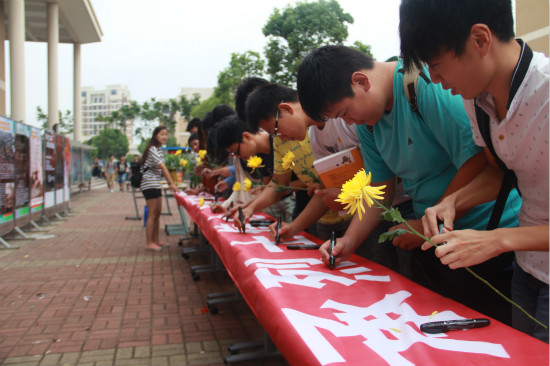 国庆勿忘祭先烈,为了更好地继承先辈的革命理想精神,自9月28日以来,学校开展了“烈士纪念日”系列主题活动,分为“看•做•写•行”四大板块。在活动开展现场,很多同学将亲手制作的白色菊花插在花篮上、把叠好的千纸鹤悬挂在树上,表达对烈士先辈的缅怀之情。正在参加横幅签字仪式的化工学院研二学生张越同学说:“先烈身上凝聚着民族的宝贵精神财富。平时我们把很多的时间和精力都是放在专业知识的学习上,参加这样的主题活动,不仅仅是为了把自己的名字写在这里,更重要的是,写下自己的情怀,同时,这样的主题活动让我们知道,曾经有一群人为了我们现在幸福的生活奉献出了宝贵的生命。”