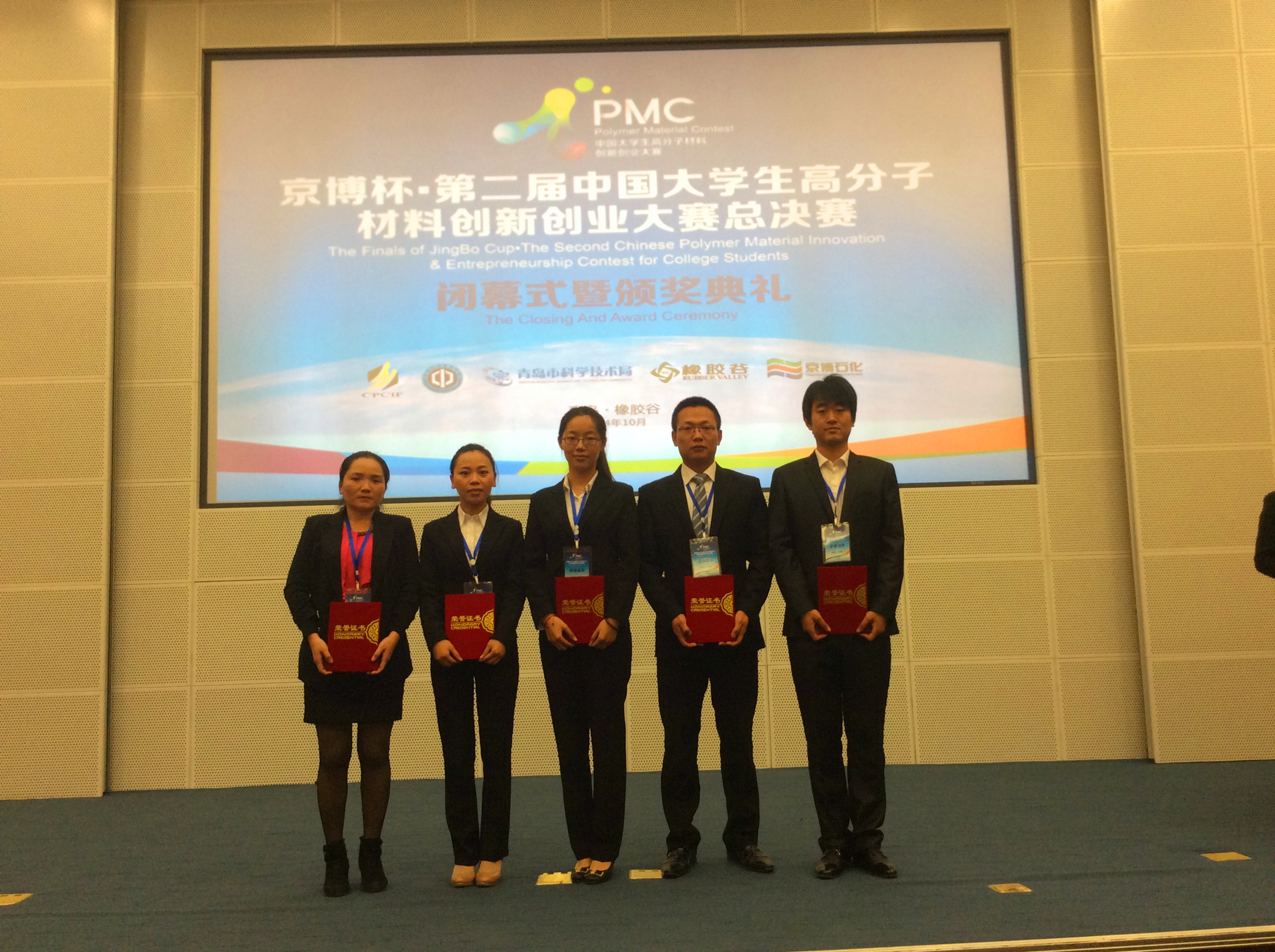 10月14日,京博杯•第二届中国大学生高分子材料创新创业大赛(简称PMC大赛)在青岛拉开决赛序幕,由我校材料学院贾润萍老师指导的“睿思成材”研究生队,经过近5个月的充分备战,在来自全国130余所高校的432支参赛队伍中脱颖而出,获得三等奖的佳绩,贾润萍教授获得优秀指导教师称号。