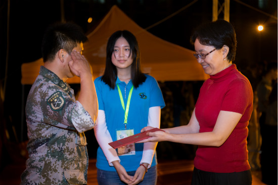 9月24日晚,“迷彩军训·青春无悔”2014年联欢晚会在奉贤校区运动场举行,副校长张艳萍出席晚会并为参演教官代表颁发特别荣誉奖。南京军区上海警备区特警团部队代表胥志勇营长,校武装部、学工部、团委相关负责人,各二级学院学工负责人等参加联欢晚会。