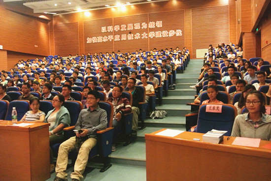 老生代表2012级研究生王永光同学结合自己的求学经历,从合理安排时间、努力专心做事和多交流勤思考三个方面和新生作了分享。新生代表2014级研究生葛欢同学则从树立远大志向、参加社会实践、加强道德修养三方面进行了发言。