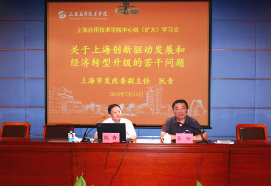 7月11日下午,学校在奉贤校区行政楼117会议室召开党委中心组(扩大)学习会,上海市发展和改革委员会副主任阮青应邀在会上作题为“关于上海创新驱动发展和经济转型升级的若干问题”的专题报告。校党委书记吴松主持报告会。校党委副书记宋敏娟,副校长陈东辉、叶银忠、张锁怀出席会议。