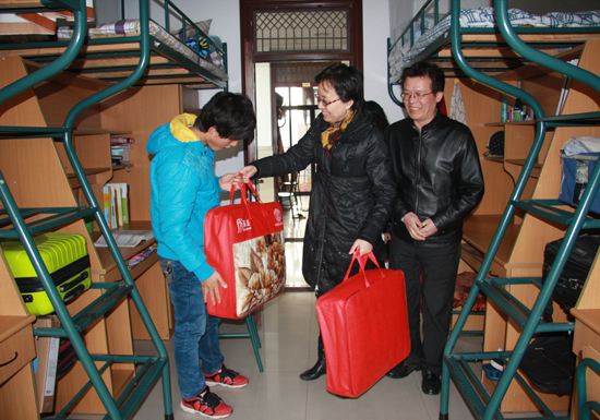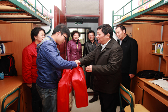 校领导来到学生宿舍向受资助的学生发放御寒物品,亲切询问了同学们在学习、生活等方面的情况,勉励受资助学生克服困难、积极进取、发奋学习、立志成才。
