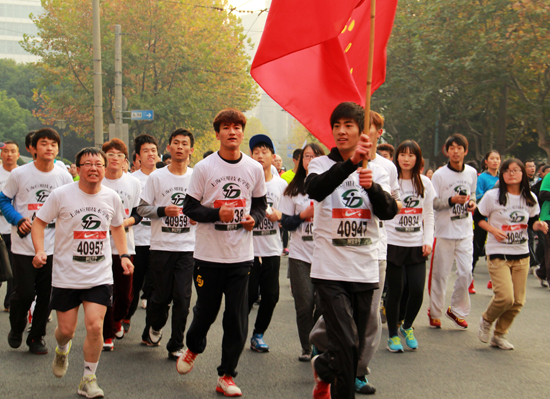 临近发令时,起点区已是人群接踵、人声鼎沸。而我校超大号的红色校旗、印在运动员白色T恤上的校名和我校特有的活动口号“‘上马’,我来了”,在众多跑友中显得格外引人注目。运动员们不断地向欢呼雀跃的人群和空中盘旋的航拍直升机齐声高呼着:“‘上马’,我来了!应技加油!上海加油!”。随着国家体育总局和市领导的发令,运动员们随着3.5万人的庞大队伍出发了。在5公里健身跑的赛程中,运动员们以灿烂的笑脸、整齐的步伐、完整的队形,始终吸引着参赛者和围观市民的目光。当30名运动员无一掉队地冲过终点,守候多时的志愿者立即递上衣服、水和食物。运动员似乎意犹未尽,个个兴高采烈,久久不愿离去……