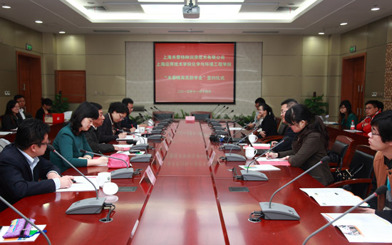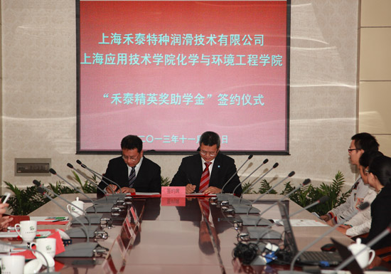 11月14日上午,上海禾泰特种润滑技术有限公司与我校化学与环境工程学院设立的“禾泰精英奖助学金”签约仪式在图书馆B103举行。校党委书记吴松出席签约仪式,与企业负责人互赠纪念品并讲话,他指出在学校发展过程中,应该加强产学研合作,依靠校企双方共同努力,培养应用技术型人才;应该提高人才强校发展,更加注重师资中专业技术力量的培养和提升;应该拓宽教育教学改革中的国际化视野。