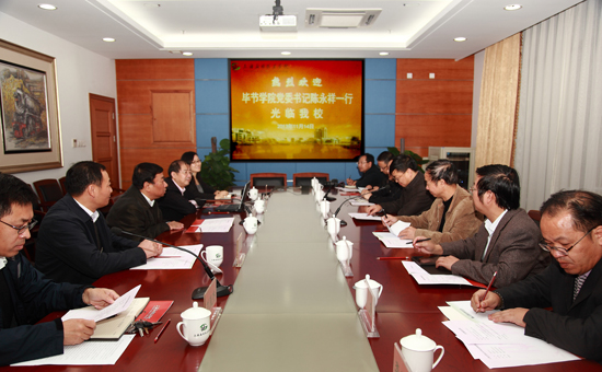 11月14日上午,毕节学院党委书记陈永祥、副院长陈明刚一行10人前来我校访问考察。校党委书记吴松、党委副书记宋敏娟、副校长刘宇陆热情接待陈永祥书记一行。