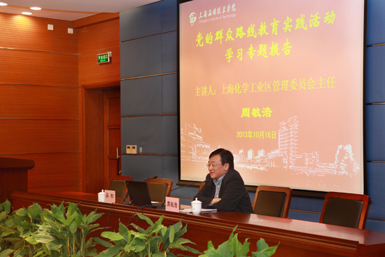 10月16日下午,学校在奉贤校区行政楼举行党的群众路线教育实践活动学习专题报告,我校校友、上海化工区管委会主任、党组副书记周敏浩应邀来校做报告。党委书记吴松,校长卢冠忠,副校长刘宇陆、陈东辉、张锁怀、张艳萍出席,全体中层干部(含助理)、党员代表等参加学习。吴松主持。