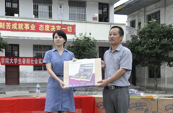 随后举行了社会实践基地揭牌,廖东根希望同学们在支教过程中充分展现当代大学生风采,收获感悟,实现理想。韩磊和志愿者代表分别向大沽乡中心小学生们赠送了学习用品和精心准备的礼物。江西省宁都县电视台对本次活动做了采访和报道。