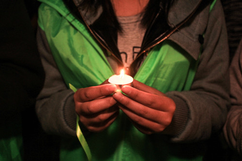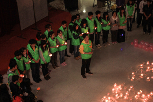 晚上8点30分,黑夜中亮起了温暖的蜡烛。在大学生活动中心一楼,大家用数百支蜡烛在心型中围成“雅安4•20”的字样,手捧蜡烛,静静默哀,为在地震中不幸罹难的人们祈福。心形的蜡烛摇曳着,模糊了同学们的视线,一首写给地震同胞的小诗,更是让大家低低啜泣。在主持人的带领下,大家一遍又一遍地高喊着 “雅安,加油!”,整齐响亮的加油声回荡在夜空之中,振奋人心。