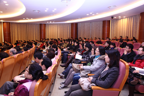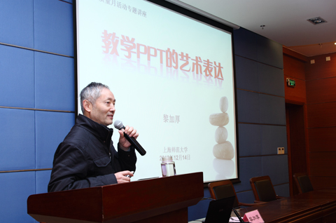12月14日上午,学校在奉贤校区行政楼117报告厅召开了2012年教学质量月第三场专题报告会,特邀全国信息技术教育专家、上海师范大学教育技术系黎家厚教授作“教学PPT的艺术表达”主题报告。会议由教务处处长周小理主持,各二级学院教学、实践副院长、学科专业带头人、教研室主任、青年教师等近150人聆听了报告。