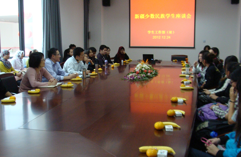 值新疆少数民族学生重大节日—古尔邦节到来之际,为进一步做好我校少数民族学生的学生工作,10月24日中午,学工部和后保处在学生活动中心207会议室联合召开了新疆籍少数民族学生座谈会,会议由学工部部长熊焰主持。学工部副部长朱美陶、后保处副处长羊忆军以及各学院新疆籍少数民族学生代表近40人出席会议。
