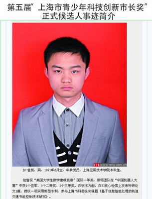 日前获悉,我校工程创新学院09级学生曾凯同学喜获第五届“上海市青少年科技创新市长奖”正式候选人提名。