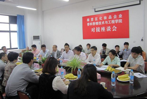5月8日,奉贤区人大常委会副主任、区科协副主席汤芷萍带领奉贤区化妆品行业15家企业负责人来访我校洽谈产学研合作。科技处处长金鸣林、香料学院院长肖作兵以及香料学院教授、教师代表等参加座谈会。