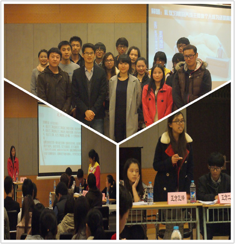 辩论赛的正方是来自时事研究协会的四位同学,反方是来自岚风心理社的四位同学,双方就辩题展开了激烈的辩论。继精彩的放狠话环节后,双方正式进入辩论环节。在义正言辞地阐明各自观点之后,双方进行激烈的攻辩环节,现场气氛迅速升温,比赛一步步地被推向高潮。自由辩论环节,辩手们反应机敏,语言流畅,说理透彻,精辟的措辞、犀利的言辞展现出咄咄逼人的气势,气氛也随之达到了顶峰。总结陈词环节,双方四辩引经据典,异常精彩。在场同学们积极参与提问环节,语言犀利精彩,丝毫不亚于场上选手。随着颁奖仪式的结束,辩论赛正式落下帷幕。