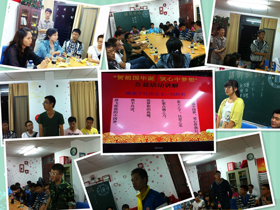 为庆贺祖国64岁华诞,深入学习贯彻宣传党的十八大精神,激励广大学子坚定理想信念,奋发图强,9月29日晚,城建学院组织召开“贺祖国华诞,筑心中梦想”主题沙龙,学院辅导员老师与来自学院30多名新生代表参加,畅所欲言。