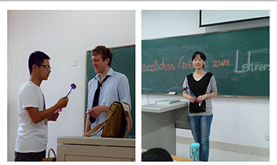 大二英语一班,学生代表为老师奉上了新鲜娇艳的花束以及写满祝福的温暖小纸条。大二德语二班,文艺委员在黑板上写下了“祝老师教师节快乐”,当老师走上讲台发现了充满爱意的祝福后,露出欣慰的微笑,老师们表示了感谢,班里洋溢着温馨浓郁的师生情谊。