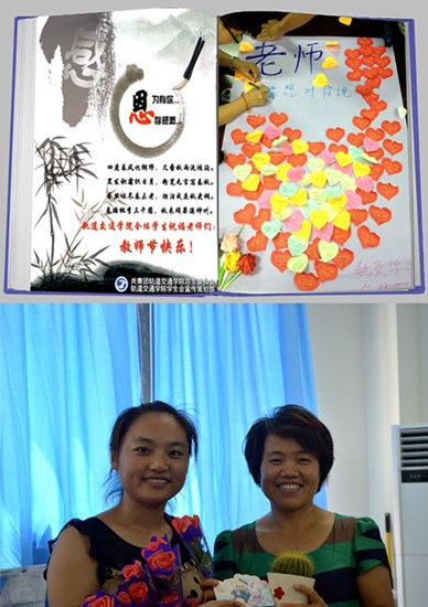同学们精心准备了表达感激之情的海报——“因你而在,心存感激”,贴满了全院学生写给老师的“心”形祝福语。带着一颗热忱的心,同学们把准备好的玫瑰花、盆栽和祝福贺卡送到各位老师手中,表达了同学们的感激之情,又倡导了绿色环保理念,让老师脸上洋溢着幸福的笑容。同学们特意为女教师们精心准备了玫瑰花,希望她们永葆青春。各位老师与学生代表们亲切交流,勉励他们努力学好专业知识,回报社会。