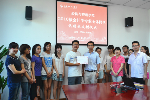 7月10日,在经管学院2010级学生即将搬迁徐汇校区之际,2010级会计学专业认捐校友树仪式在行政楼301会议室举行。校办副主任毕劲松、经管学院党总支副书记王真、校办曹长清老师,以及10级会计专业辅导员侯巧凤出席仪式。会计专业全体党员及班委代表参加认捐仪式。