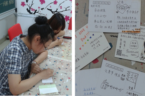 活动中,大家相互分享了自己同父亲之间发生的感人故事,道出了对父亲不曾说出的那份真挚的爱。在主持人的组织下,同学们纷纷拿起笔把对父亲的爱写在明信片上,“爸爸我爱你”、“老爸身体健康,天天开心”、“父亲节快乐”、“老爸万岁万岁万万岁”、“谢谢爸爸为我所做的一切”“感谢您爸爸,感谢一路有你”……,一张张寄托着爱的明信片瞬间铺满了桌子。