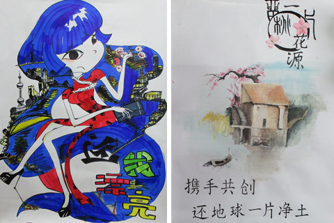 比赛共征集到二十余幅作品,全部由学生亲手制作完成。学生们从生态文明、绿色出行、饮食卫生等多角度出发,充分发挥创造能力,阐释自己眼中的绿色文明。作品日前在大学生活动中心一楼大厅展出,吸引了无数师生驻足观赏。